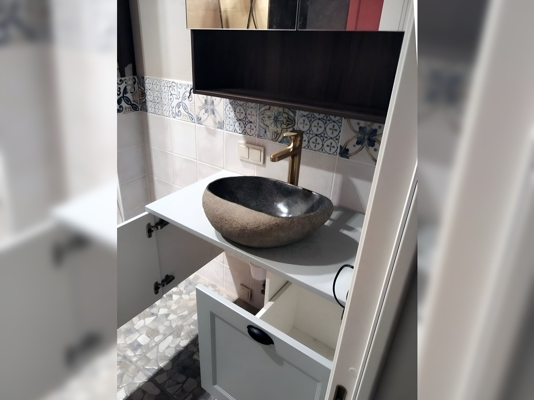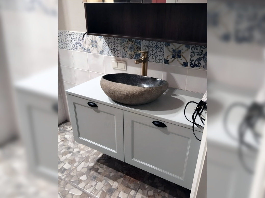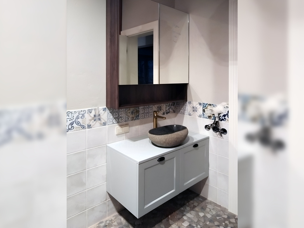 Подвесная тумба под раковину, шкаф для хранения вещей с зеркальными фасадами и сантехнический шкаф. Дверцы открываются нажатием на фасад с помощью механизма push-to-open.