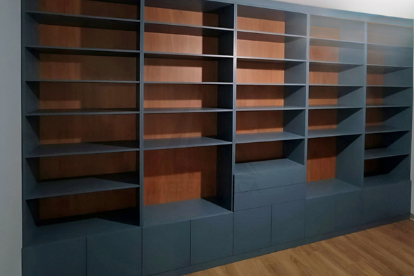 Книжный стеллаж в синем цвете. Верхняя часть - открытые полки с книжной раскладкой, нижние фасады - с механизмом push-to-open. Фасады выполнены из МДФ в матовой эмали. Корпус сделан из высококачественного ЛДСП Egger. Фурнитура Hettich.