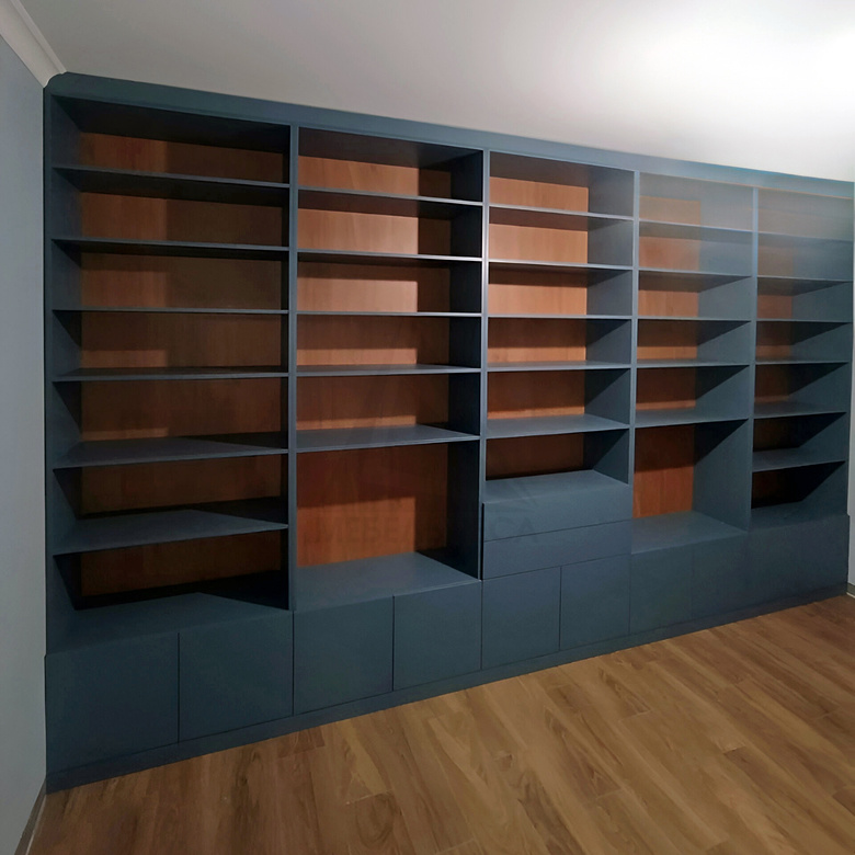 Книжный стеллаж в синем цвете. Верхняя часть - открытые полки с книжной раскладкой, нижние фасады - с механизмом push-to-open.