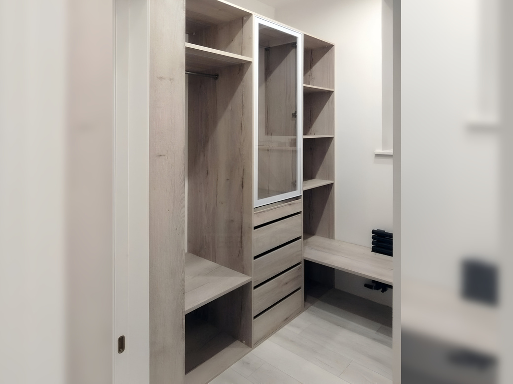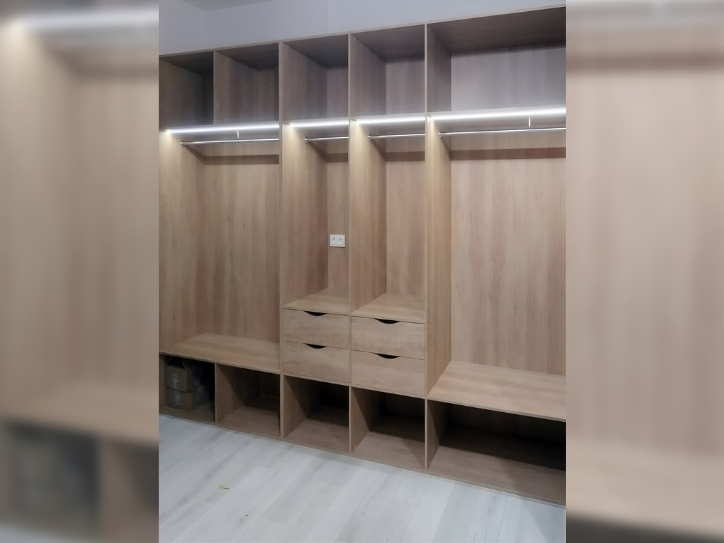 Вместительная гардеробная с подсветкой, в которой вы сможете хранить всю вашу одежду, обувь и аксессуары.