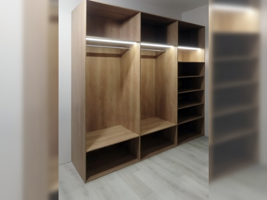 Вместительная гардеробная с подсветкой, в которой вы сможете хранить всю вашу одежду, обувь и аксессуары.