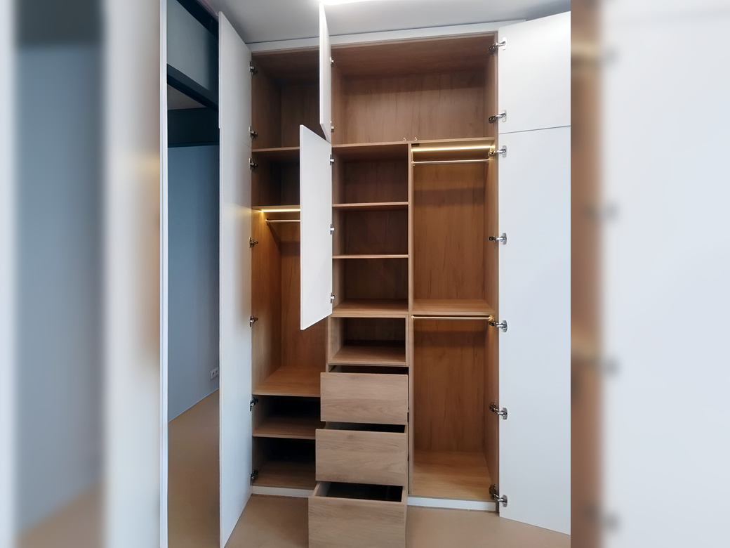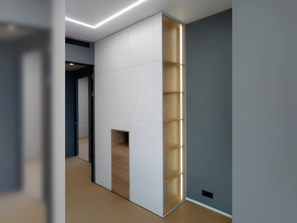 Распашной шкаф со стеллажом и подсветкой. Фасады открываются по нажатию с помощью механизма push-to-open.