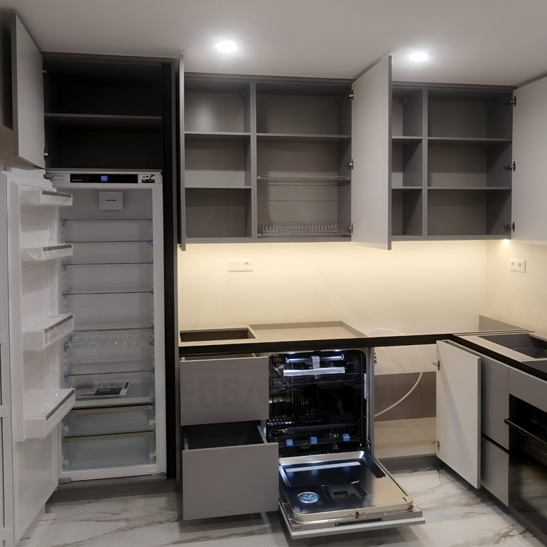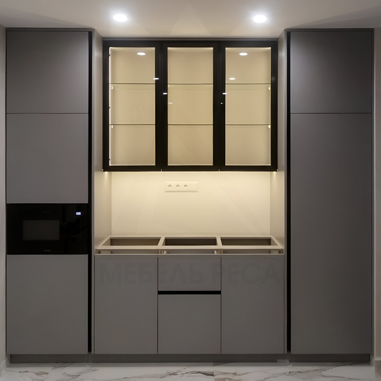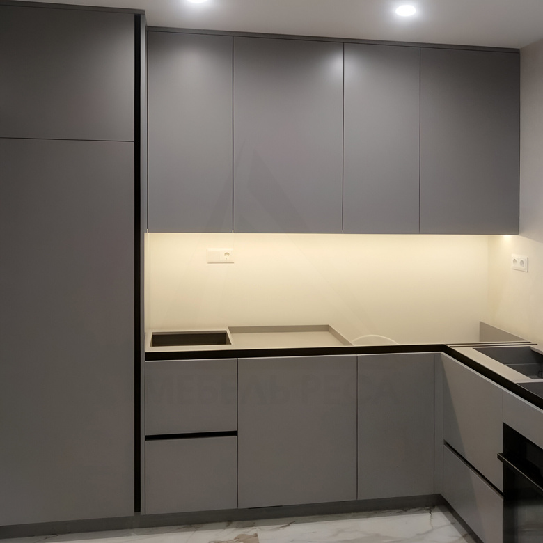 Кухня в сером цвете. Без столешницы. Фасады открываются по нажатию с помощью механизма push-to-open.