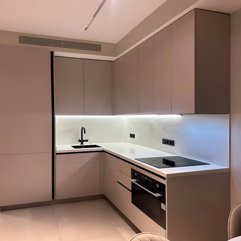 Угловая кухня в современном стиле. Фасады открываются по нажатию с помощью механизма push-to-open.