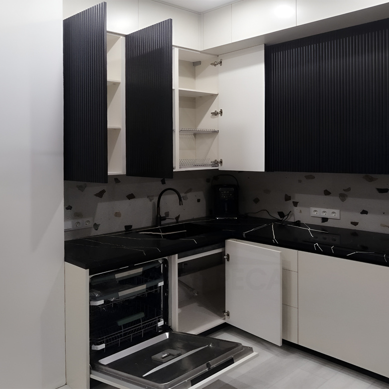 Фасады выполнены из МДФ в матовой эмали с фрезеровкой.