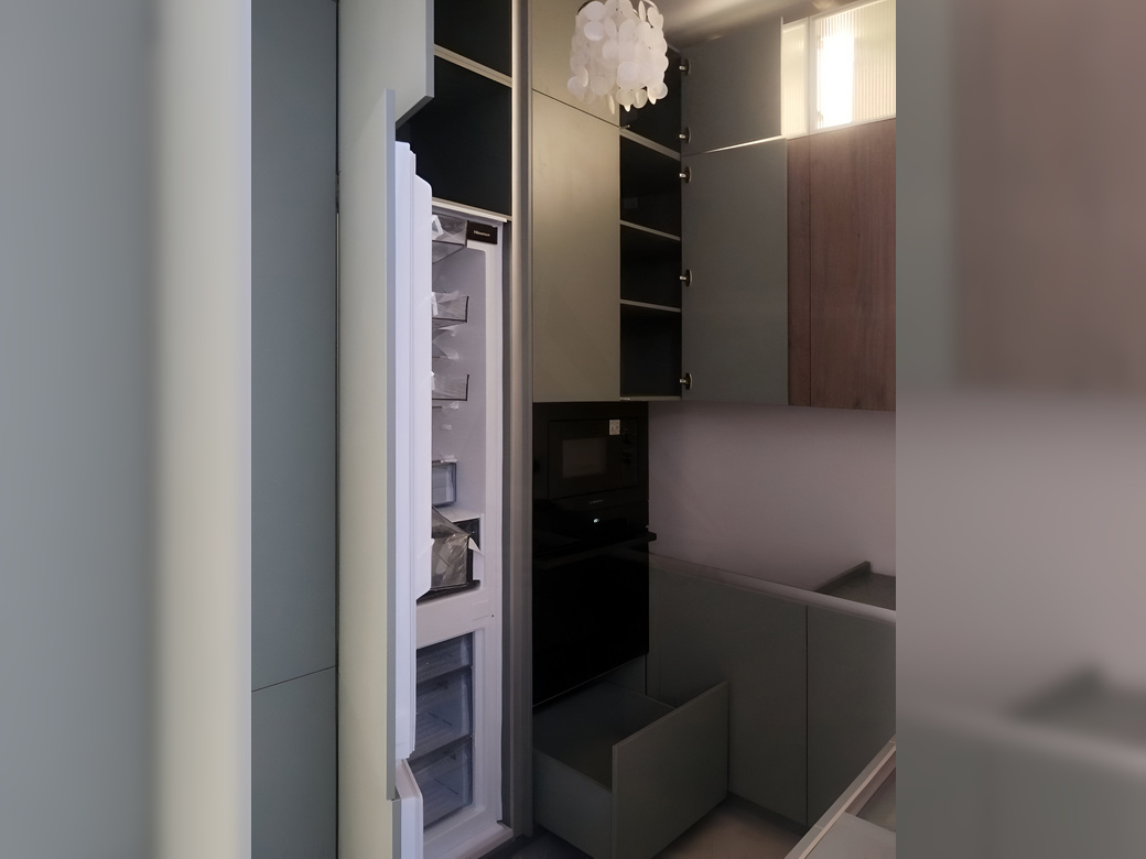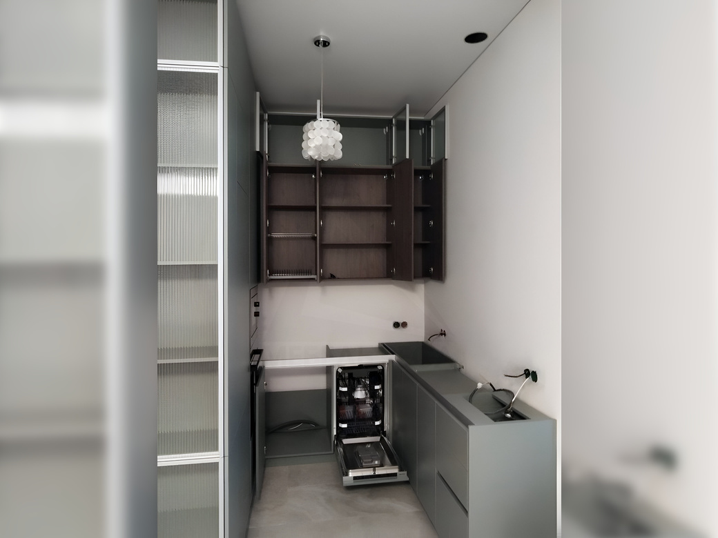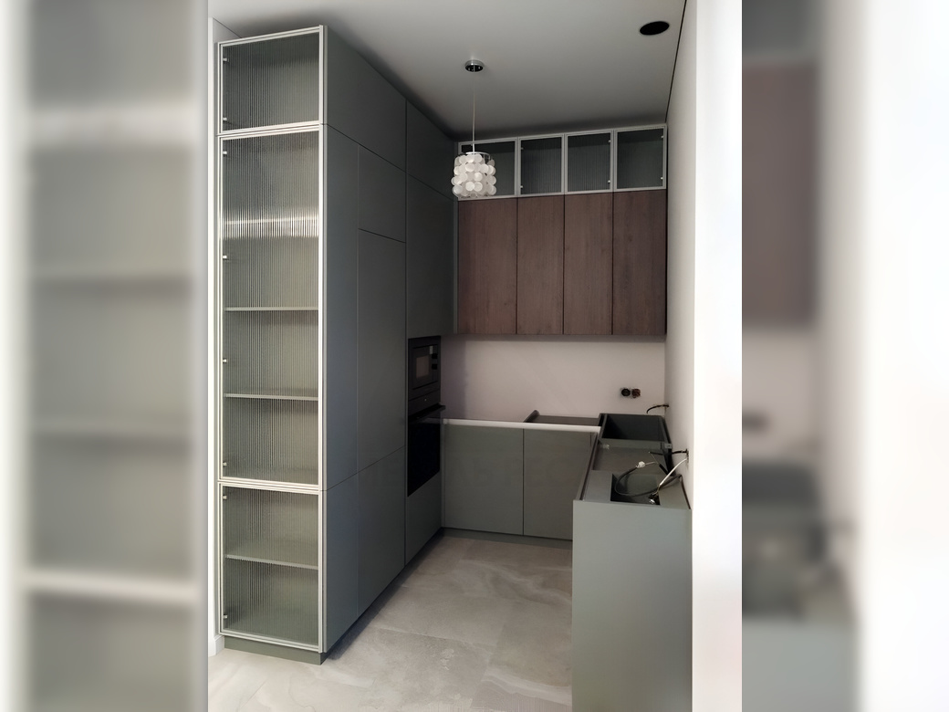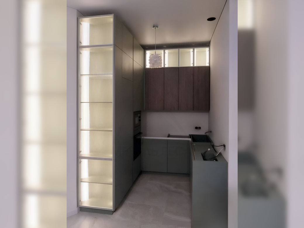 Небольшая угловая кухня с подсветкой. Фасады открываются по нажатию с помощью механизма push-to-open.